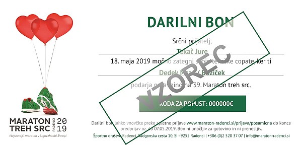 Vse kar morate narediti je, da nam na info@maraton-radenci.si pošljete vaše ime in priimek ter ime in priimek osebe, ki jo želite obdariti in poravnate prijavnino. Prejeli boste darilni bon, s katerim boste presenetili tekaške prijatelje. :)
